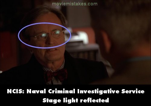 Visible crew/equipment: When Ducky says he caught the medical examiner and is discussing their findings, a square stage light is reflected in his glasses. (00:20:00)