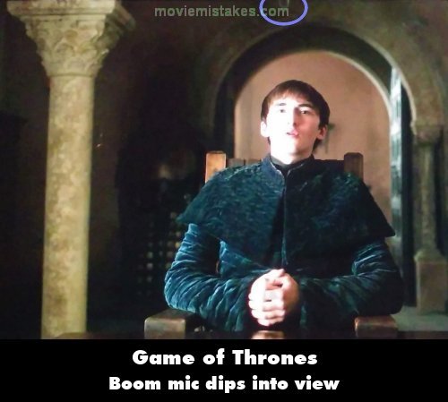 Visible crew/equipment: When Bran joins Tyrion and the others at the small council meeting, Bran begins by saying that they appear to be missing a Master of Whisperers, then just as he says, "And a Master of Laws," the boom mic can be seen dipping into view over Bran, at the top of the screen (visible on Hulu). (01:11:00)