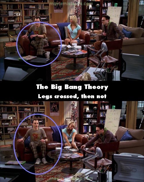 Continuity mistake: When Sheldon is told to sit he does so with his legs crossed. Camera changes and they aren't. (00:08:50)