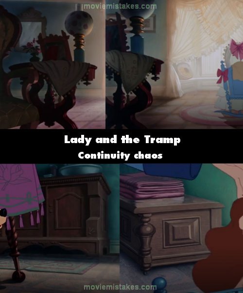 Continuity mistake: When Lady enters the bedroom where the baby is put asleep, the wall in the back is an absolute chaos: A wooden chest appears/ disappears randomly; the things on the chest magically disappear only to become a blanket in the final shot; the mirror becomes a painting, and, last but not least, the wall has either a smooth paint or a wallpaper with flower motifs.