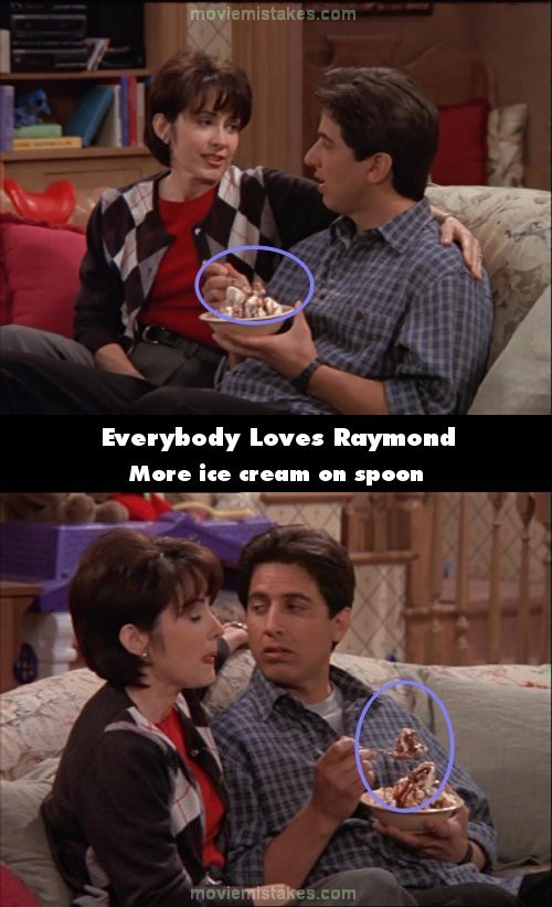 Continuity mistake: The amount of ice-cream on Ray's spoon on the sofa increases dramatically between shots. (00:13:10)