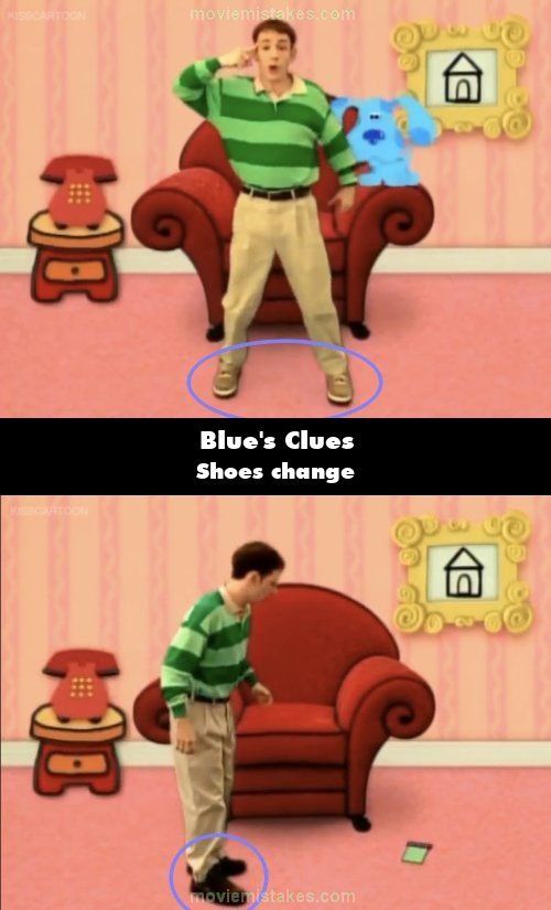 Continuity mistake: When Steve sings the Blue's Clues theme, he is wearing tan shoes he wore in few other episodes. When he drops his notebook after the theme, he is back in his brown shoes.