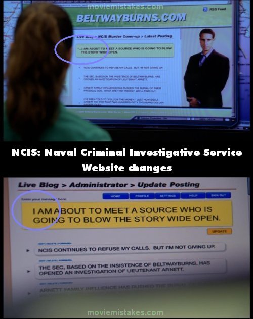 Continuity mistake: The blog post that the NCIS team pulls up starts differently to the one that is typed out at the start of the episode. (00:00:15 - 00:07:00)