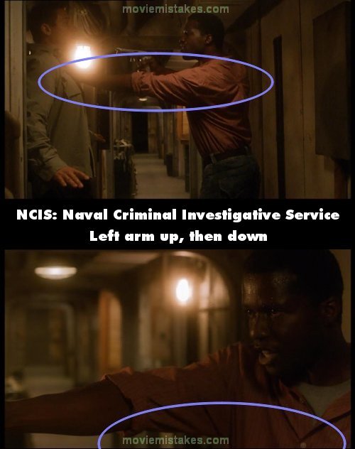 Continuity mistake: On the Damaclease, we see one of the crew confront Ziva's associate and pin him to The Wall with a gun trained on him. Camera changes to a close up and the arm holding the associate to The Wall has disappeared. (00:18:25)