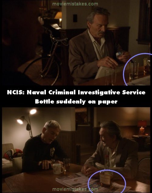 Continuity mistake: When Mike is talking to Gibbs in his house, he has a bottle of scotch on the table. A few shots later, without it being touched, the scotch is now on the paper. (00:14:15)