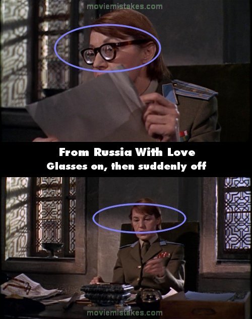 Continuity mistake: When Rosa Klebb is interviewing Tatiana, she is wearing a pair of glasses, and she makes a reference to Tatiana having had three lovers. Then, as Tatiana answers back, Klebb is no longer wearing the glasses. (00:15:50)
