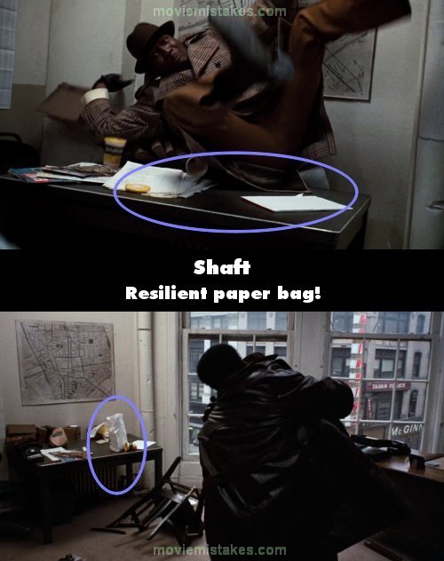 Continuity mistake: During the brawl in his office, Shaft sends the plaid coated man flying all over the table to the left of the window, right where there's a white paper bag. A moment later in the fight, that flimsy paper bag is still where it was, totally uncrushed by his butt. (00:10:40)