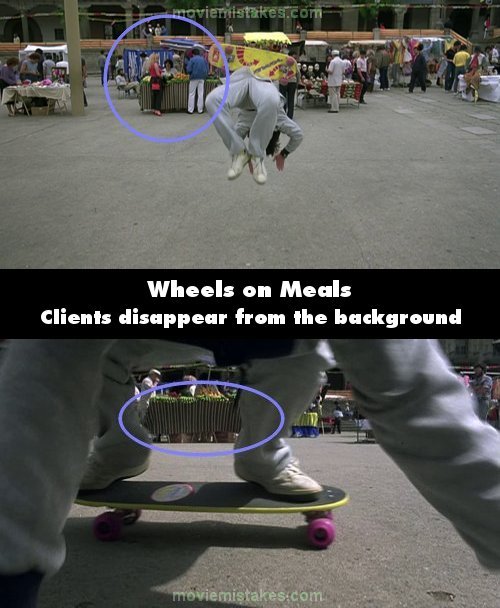 Continuity mistake: When David tosses the skateboard to Thomas so he can start taking orders and serving clients, Thomas backflips onto it. You can see behind him a veggie stand with 2 customers, that have completely disappeared in the shot when he lands on the skate. (00:13:15)