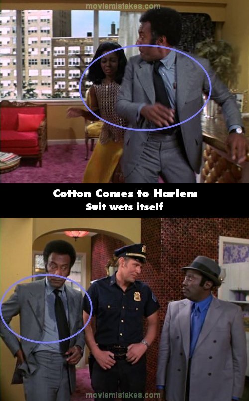 Continuity mistake: Iris splashes Coffin Ed with the glass as he speak into the phone receiver. She barely gets him and in the same shot as he turns towards the camera to grab her, his jacket and shirt have barely any wet spots. Throughout the scene the stains change in number and size for no reason (even assuming some might have dripped from the cheek to the jacket). (00:17:45 - 00:18:55)
