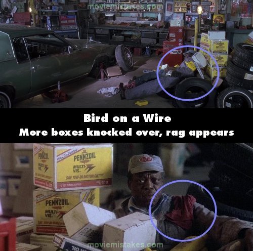 Continuity mistake: When Marvin falls back after the legs prank, he knocks down several bottles of motor oil, but two piles of boxes stay up. In the close-up that follows Mel Gibson's yuckety laughter, there's just one pile behind Marvin, and he suddenly has also a red rag on his shoulder (the same rag Gibson picks up later since it falls off the pants of the fake legs when 'Billy Ray' picks them back up). (00:07:40)