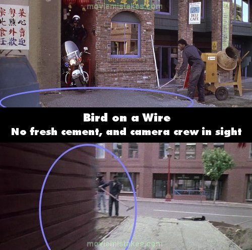 Revealing mistake: When the "I'm in pursuit" guy splashes his bike into the cement, not only in the side view is there no fresh trace of Rick's bike (and the construction worker is even using his squeegee as if nothing happened), but in the POV shot you can even see that the bike is coming out of the alley into a solid well paved sidewalk. You can actually even see a camera crew (but this last part of the mistake is discernible just if you slow motion). (00:55:05)