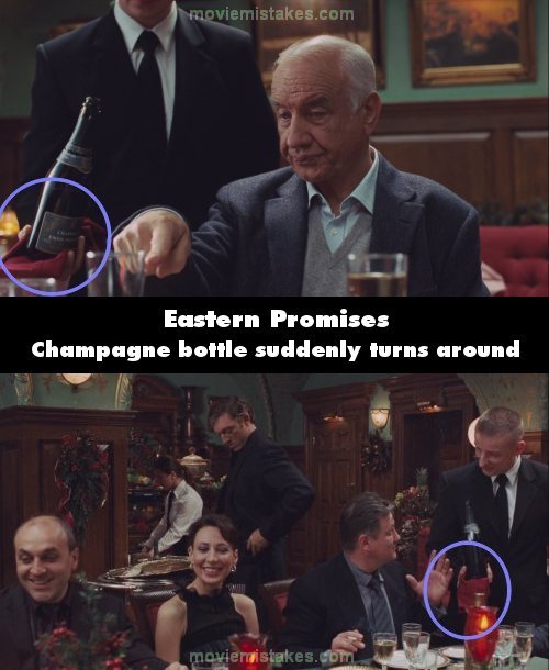 Continuity mistake: During the banquet, Semyon motions to the waiter that offers to pour him champagne, to serve the guest to his right instead. The bottle was showing the label to the camera, but in the new shot it made a 180° turn, the label faces the waiter instead. Moreover, the waiter exits left but is walking right behind Semyon right a split second later in the reaction shot as Semyon looks at his son answer the phone. (00:15:10)