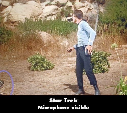 Visible crew/equipment: While Kirk and Spock are being chased, McCoy hears the gunfire so he stands up and walks away from the rock, then just as McCoy stops to use his communicator to contact Enterprise, the ground microphone is visible at the bottom, left corner of the screen. (00:02:30)