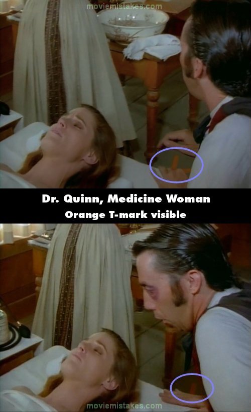 Visible crew/equipment: While Myra is lying on the table before her surgery Dr. Mike tells her she's almost ready to begin, then just as Horace is about to stand up the orange T-mark is visible on the floor. (00:38:30)