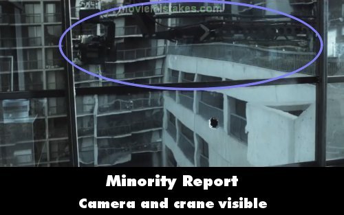 Visible crew/equipment: When John Anderton shoots Leo Crow, the camera mounted on a crane can be seen reflected on the building's glass in the outside shot just a second before the man defenestrates himself.