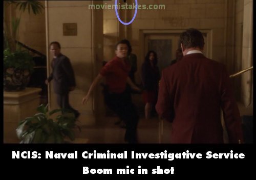 Visible crew/equipment: As Ziva runs into the hotel worker in the lobby, a boom mic drops into view very quickly. (00:13:39)