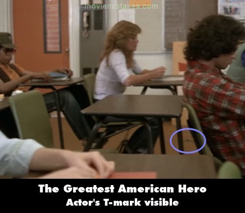 Visible crew/equipment: After Ralph's interference with the unmarked police car while he's inside the manhole, when it cuts to the high school Ralph asks if anybody has seen Tony, and just as the camera passes Rhonda the T-mark is visible on the floor near the other female student's desk. In a few moments Ralph will walk over and stand at that spot. (00:07:45)