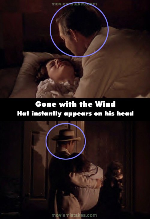 Continuity mistake: When Rhett picks up Melanie from her bed to take her out of Atlanta he is not wearing a hat, but in the next shot it is on his head. (01:19:35)