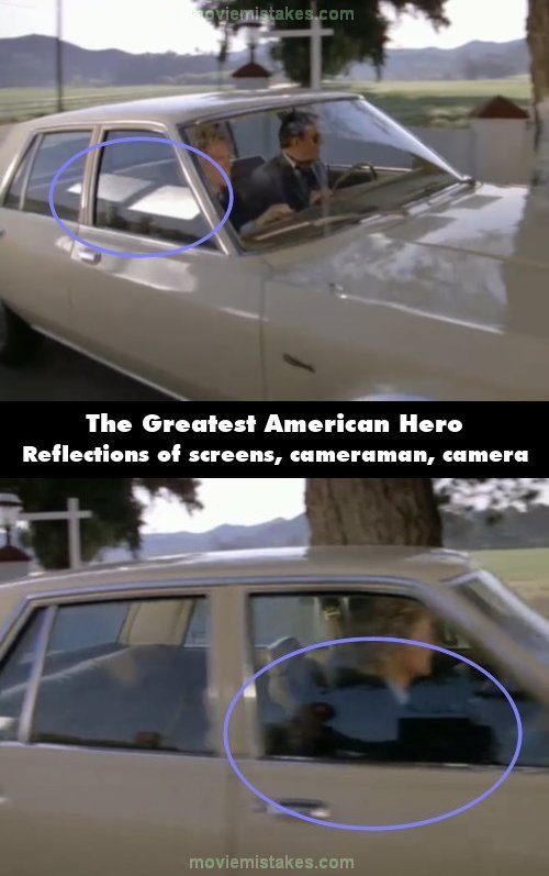 Visible crew/equipment: After Bill and Ralph leave the restaurant to pay Prentiss Hall a visit, when it cuts to Bill slowly driving past the camera, we can see the reflections of the reflector screens, and the cameraman with the camera. (00:26:20)