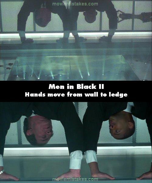 Continuity mistake: When Agents Jay and Kay are in the elevator avoiding the garbage can robot who is shooting at them, watch their hands - they move from the wall to the roof ledge for support as the camera angle changes. (01:02:10)