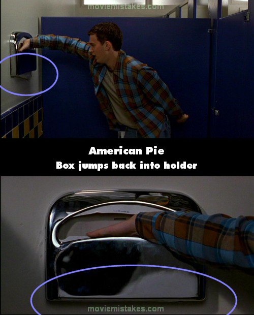Continuity mistake: Finch runs into the girl's bathroom when the laxatives affect him. He tries to take out a toilet seat cover, but there are none left. The side shot shows a corner of the box hanging down below the dispenser, whereas when the shot changes to the front, there is no visible corner. It then returns to the side and the visible corner, and back to the front with no corner. (00:58:35)