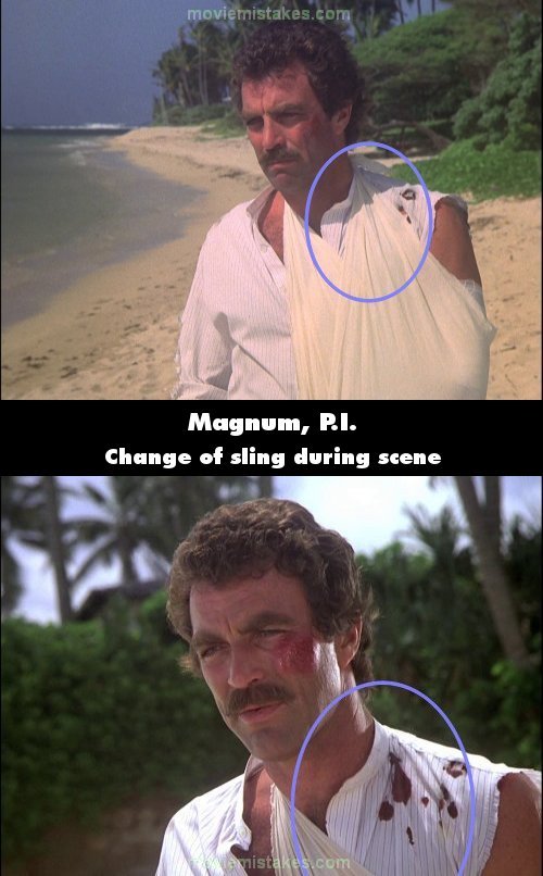 Continuity mistake: Magnum's sling looks different before the flashback and after it when he speaks with Higgins. (00:48:50)