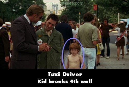 Revealing mistake: When Travis starts spelling his phony name out to the security guy, a ginger kid walks in, stares at the camera, and hides away as quick as he came. In similar fashion, another kid with a red baseball cap looks at the camera behind De Niro once this walks by evading the photographer. (01:04:20)