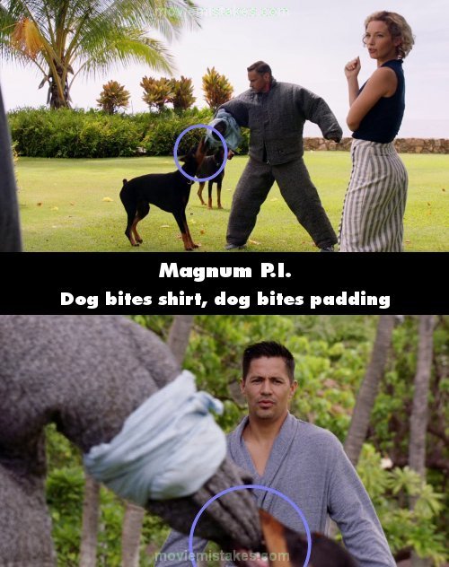Continuity mistake: At the beginning of the episode the dog bites on Magnum's shirt...at least that's the idea, because in one shot the lad is biting on the trainer' suit. (00:01:30)
