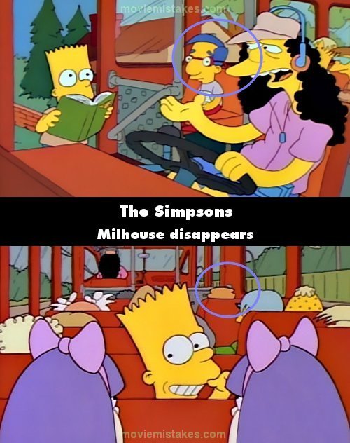 Continuity mistake: When Bart gets on the bus the day of the test, Milhouse is sitting at The Front of the bus. When we see Sherri and Terri looking at Bart, Milhouse has gone. (00:06:30)
