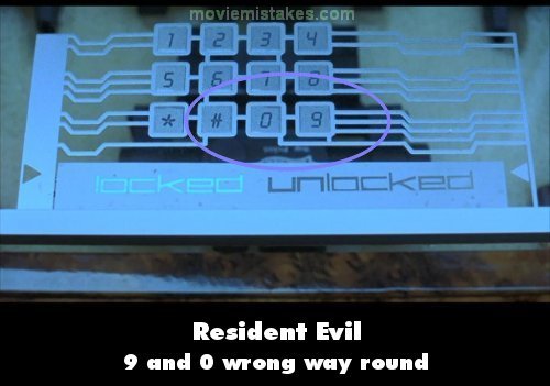 Other mistake: When we see the numbers for the coded entry to Alice's weapon, the order of the numbers is 1 - 2 - 3 - 4 - 5 - 6 - 7 - 8 - 0 - 9. The 9 and 0 are the wrong way round. (00:47:40)