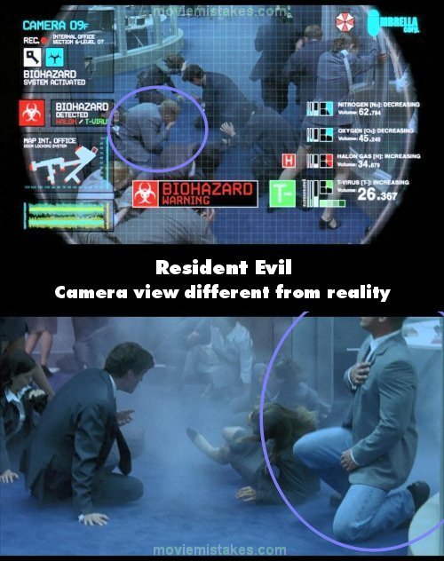Continuity mistake: When the Red Queen kills all the workers in the main office, the positions and actions of people differ from the video footage to the actual events. (00:06:35)