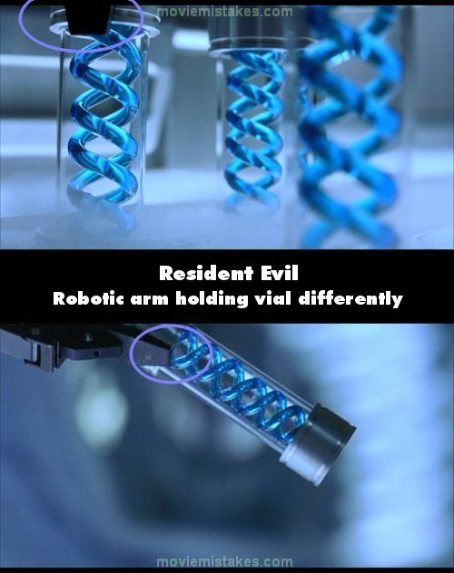 Continuity mistake: When we see the extreme close up of the robotic arm picking up the blue vial, the grip is uniform and parallel to the edge of the sliver end cap on the vial. When we see the vial a second later, the arm's grip has changed and is no longer parallel or uniform on the vial. (00:02:10)