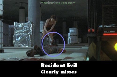 Revealing mistake: When Alice hits the zombie Spence in the head, she misses Spence by a lot. (01:18:50)