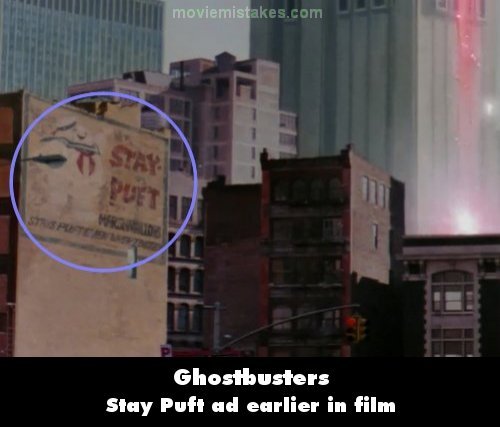 Trivia: Right after Mr. Peck the EPA man forces the Ghostbusters to shut off the grid and the energy is released into the sky, an ad for Stay Puft can be seen on a building. (01:09:00)
