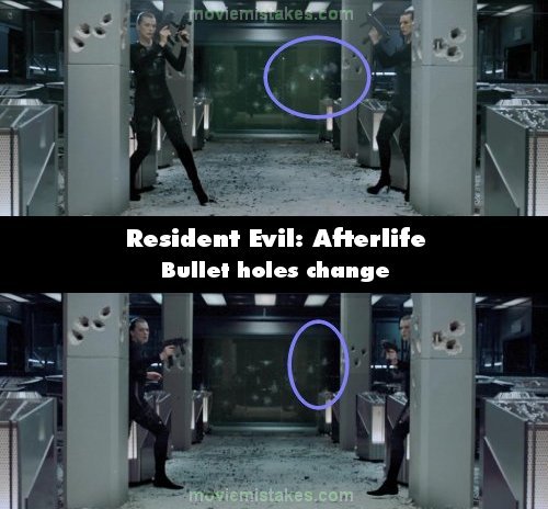 Continuity mistake: The bullet holes in the doors the two Alice clones dive through near the start are constantly changing place. (00:11:05)