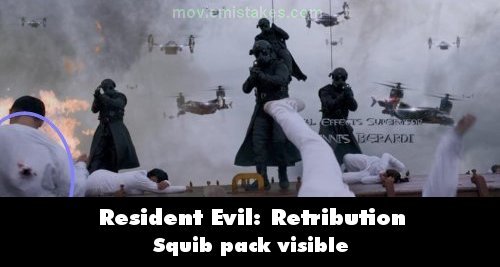 Revealing mistake: At the start during the rewinding segment we see a net return to an Umbrella soldier's gun, and a guy get up on the screen left with a bullet wound in the back. (This whole part is in reverse at this point of the film) The guy that gets up you can see the outline of the squib pack that was used for the effect. (00:03:18)