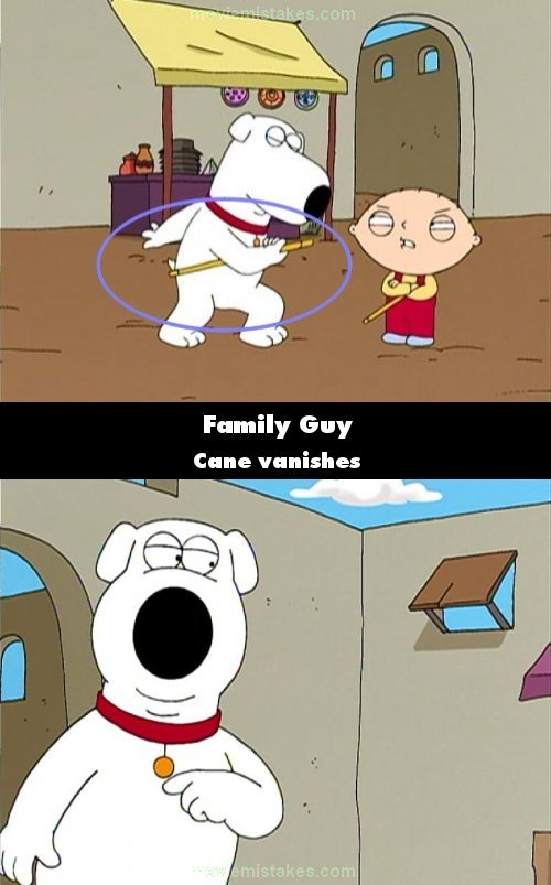 Continuity mistake: During Brian and Stewie's song, Brian's cane is constantly disappearing and reappearing in consecutive shots. (00:09:00)
