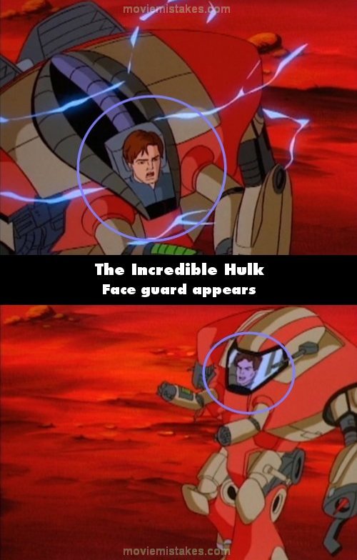 Continuity mistake: When Banner re-engages Hulk in the desert after Hulk disposes of Talbot, the face guard for the exoskeleton armor Banner is using is missing, but then reappears when Banner launches the armor's right foot at the Hulk's backside. (00:07:38)