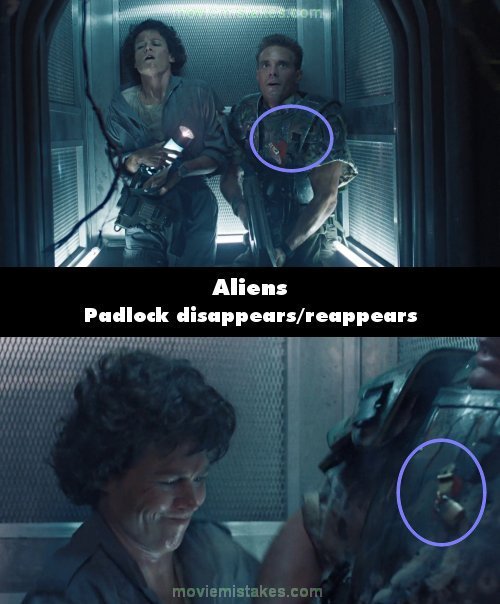 Continuity mistake: Hicks has a heart painted on his armor with a latch locked by a padlock. When Hicks and Ripley enter the elevator after losing Newt, the padlock is missing. After the Alien attack, the padlock reappears.