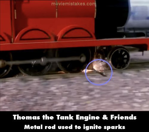 Revealing mistake: In the scene of James' wheels sparking while passing Tidmouth Sheds, a metal rod is igniting the sparks from his wheels.