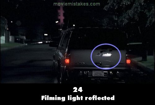 Visible crew/equipment: When Jack drives off in his car to go to CTU, as the car drives off a stage light is reflected in the cars paintwork. (00:08:05)