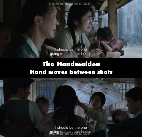 Continuity mistake: Just as Sook-Hee finishes saying goodbye, Kutan starts saying she should be the one going instead of her. It then cuts to a different angle where Sook-Hee is shown reaching her hand out to brush her hair. At the start of the shot, Sook-Hee's hand is inches away from Kutan's hair and would have been visible in the previous shot. (00:02:54)