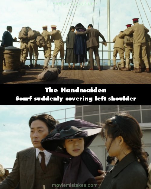 Continuity mistake: On the ferry to Shimonoseki, as Hideko becomes upset by a group of cheering soldiers, Fujiwara puts his hand around her left shoulder to console her. In the shot from behind, the part of Hideko's scarf covering the back of her neck is shown blowing in the wind in the opposite direction, as Fujiwara puts his hand on her. When the shot cuts, the scarf is suddenly covering the back of her left shoulder. (00:54:45)