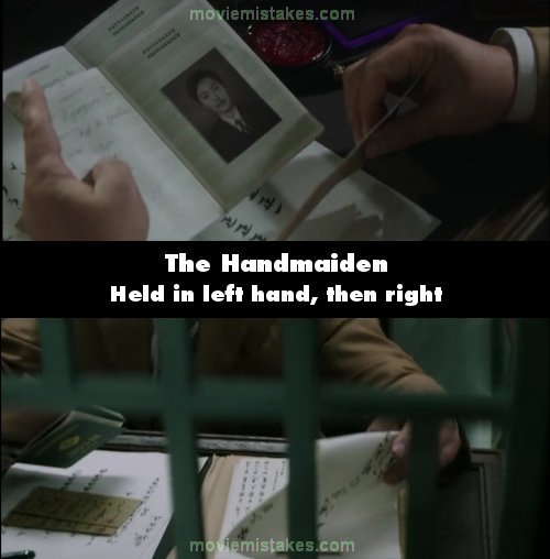 Continuity mistake: When Sook-Hee and Hideko are standing at the counter at the station to get tickets, in a close-up shot of their passports, the man behind the counter is holding the passports in his left hand and their tickets in the right hand. The man goes to look over some papers with his left hand and he is suddenly holding both the passports and tickets with his right hand. (02:08:58)