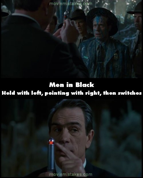 Continuity mistake: Before Kay erases the memories of the border patrol cops, he holds the neuralizer with his left hand while adjusting its knobs with his right hand. In the next shot, he's holding the neuralizer with his right hand.