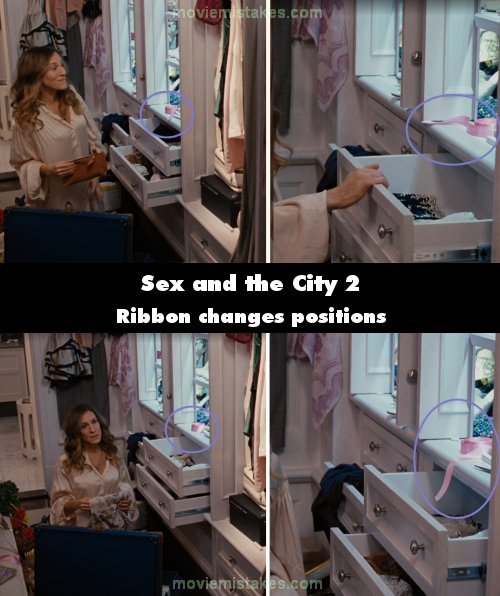 Continuity mistake: When Big tells Carrie he wants a place of his own, the pink ribbon on the shelf keeps changing positions between shots. (00:52:47)