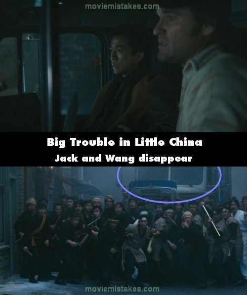 Continuity mistake: When the flying soldiers appear, there's a wide shot and Jack and Wang disappear from inside the truck.