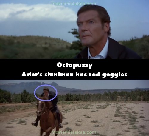 Revealing mistake: When Bond horseback rides towards the plane, Roger Moore is replaced by an obvious stunt man wearing red goggles. (02:02:50)