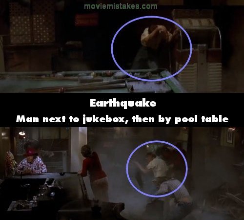 Continuity mistake: During the earthquake at the bar, a man in a yellow shirt crashes against the jukebox. A second later he is next to the pool table.