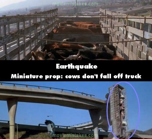 Revealing mistake: When the cattle truck falls out of the collapsing highway, none of the cows move a single inch nor fall off, revealing the real truck was replaced with a miniature prop set.